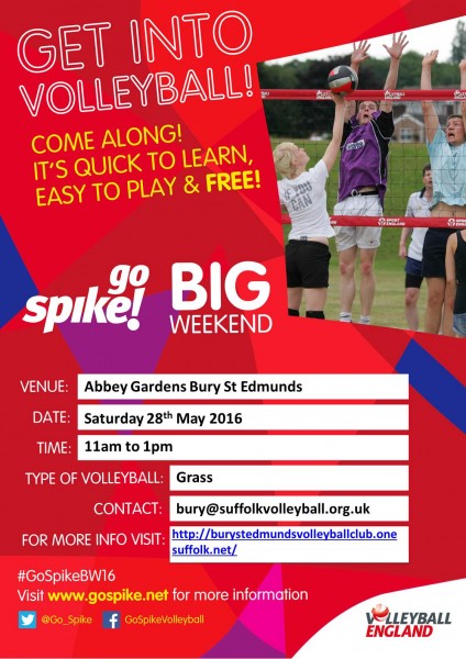 Volleyball England's Go Spike Big Weekend over the bank holiday weekend from the 28th to 30th of May. It will showcase why volleyball is a great team sport to play this summer, encouraging people to get involved and raise awareness of the local clubs where they can go and play! Free events are being held across the country to get as many people as possible to join in and find out why volleyball is one of the top three most-played sports in the world.